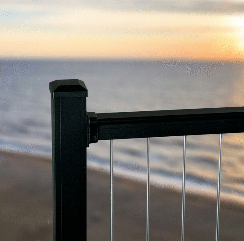 Verti-Rod aluminum railing kits are a great alternative to Vertical Cable railing options. Verti-Rod can you give you the same look as a Vertical Cable option without the labor intensive install and upkeep of Vertical Cable. Verti-Rod installs exactly like a square picket railing using a 1/4″ stainless steel rod and picket retainer for a rattle free solution.